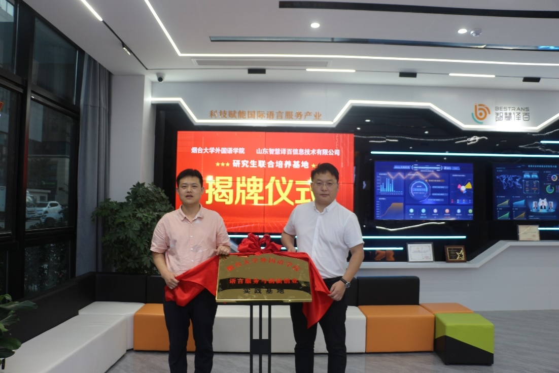 语言服务与创新创业基地建立的揭牌仪式。双方就翻译技术研发、智慧翻译建设等方面的合作进行了探讨,并针对校企合作、研究生实习基地建设、教材开发、教研活动、课程建设等问题进行了广泛而深入的交流,达成了校企合作战略共识。
