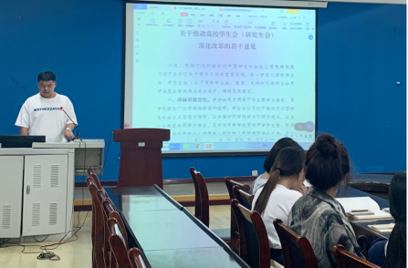 研究生会副主席谷锡领上台宣读研会相关文件,带领全体成员集体学习《关于推动高校学生会(研究生会)深化改革的若干意见》。
