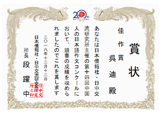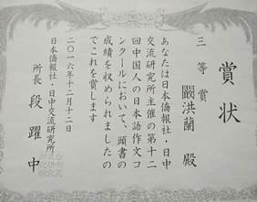 《全中国日语作文大赛》是由日本侨报社和日中交流研究所主办的目前国内规模最大的日语作文大赛。每年都有200多所高校学生参加比赛,参赛作文达到4000多篇。由日方评审员选出获奖作品,并在每年12月12日在驻华日本大使馆举办颁奖典礼及获奖者演讲大赛,邀请最优秀奖获得者拜访日本一周。每年三等奖及以上作品编辑成书在日本出版发行,上架各大书店。大象传媒